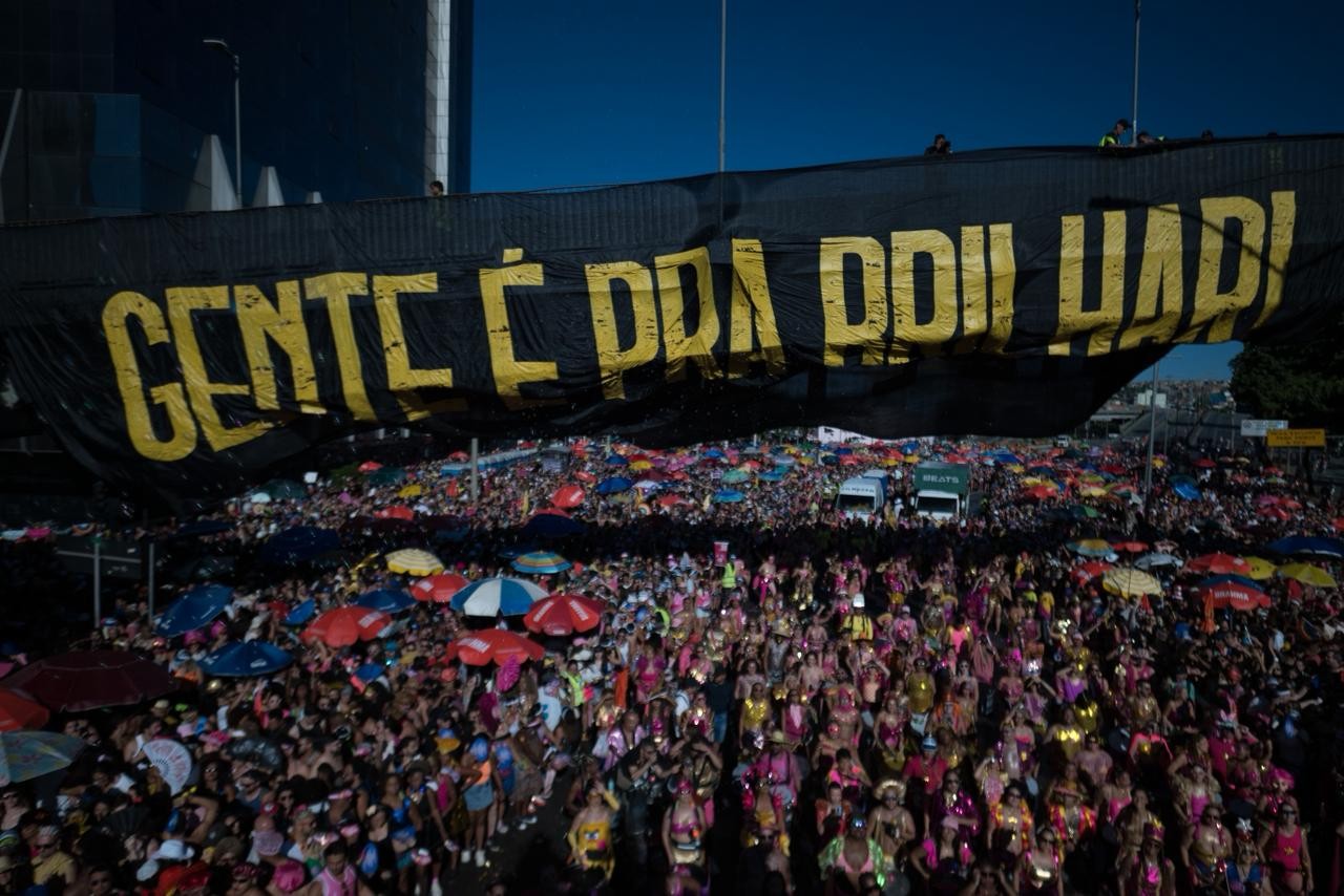 Carnaval em BH 2026: Multidão no bloco Então, Brilha! com faixa que diz 'GENTE É PRA BRILHAR', na manhã deste sábado (14)
